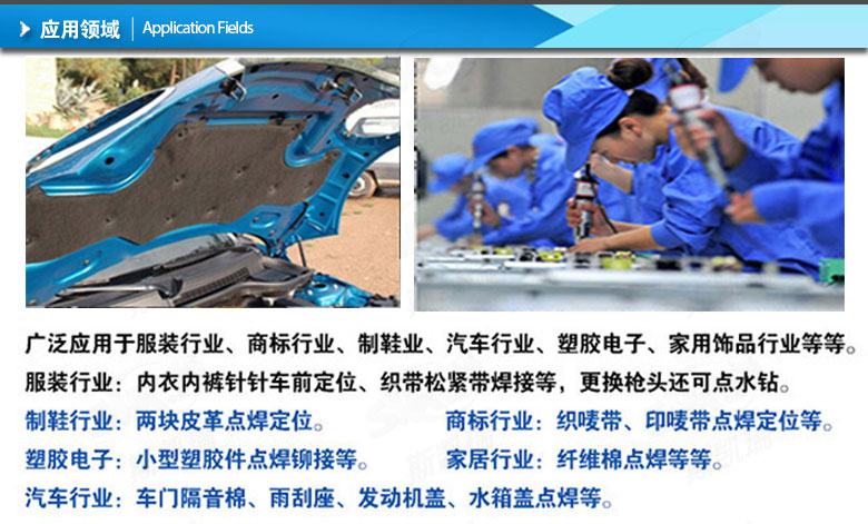 這款手提式超聲波擁有點鉆及點焊功能,適用范圍廣泛,在服裝行業(yè)、商標(biāo)行業(yè)、塑膠電子、家用品行業(yè)等領(lǐng)域得到廣泛應(yīng)用。而尤其在汽車行業(yè)中,它能夠應(yīng)用于車門隔音棉、雨刮座、發(fā)動機蓋、水箱蓋等多個方面。