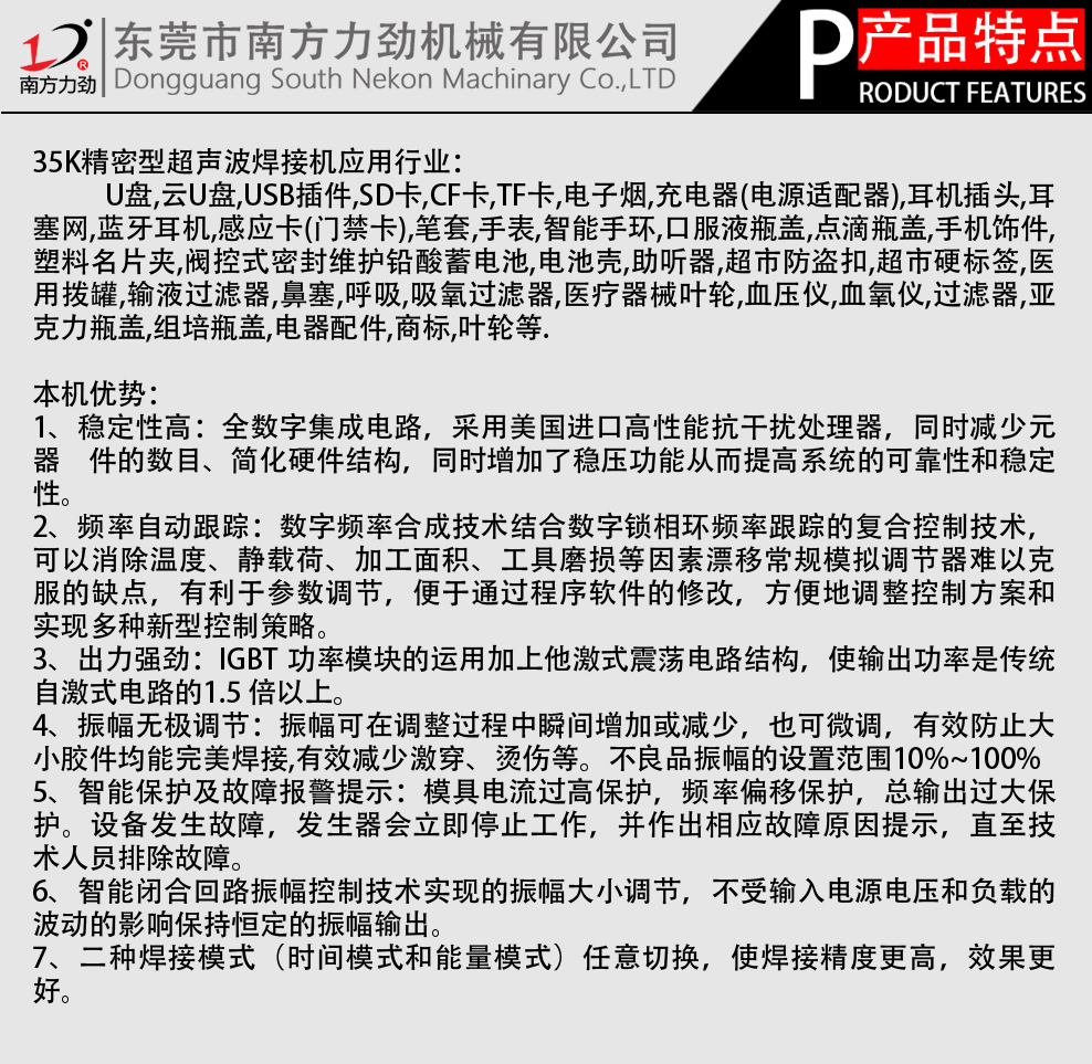 南方力勁機(jī)械有限公司是一家大型的超聲波設(shè)備研發(fā)、生產(chǎn)及銷售企業(yè),公司塑焊機(jī)事業(yè)部從事生產(chǎn)標(biāo)準(zhǔn)塑焊機(jī),2600W-3200W塑焊機(jī),4200W-5200W塑焊機(jī)等大功率焊接設(shè)備;15K、20K、28k、40K等精密型焊接設(shè)備,還有非標(biāo)塑焊機(jī)設(shè)備雙頭塑焊機(jī)四頭塑焊機(jī)、六頭塑焊機(jī)中空板膠框焊接機(jī)護(hù)欄管焊接機(jī)熱板機(jī)旋轉(zhuǎn)式熔接機(jī)汽車門板焊接機(jī)汽車儀表盤焊接汽車遮陽(yáng)板焊接機(jī)汽車燈焊接機(jī)汽車保險(xiǎn)杠焊接機(jī)等,同時(shí)為客戶設(shè)計(jì)非標(biāo)自動(dòng)化塑膠焊接設(shè)備